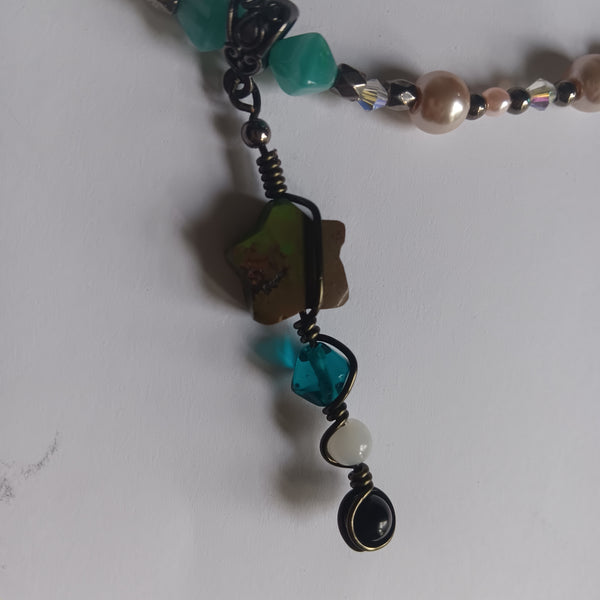 This elegant necklace showcases a striking African Turquoise star pendant complemented by aquamarine, moonstone, and onyx gemstones. Delicately enhanced with soft pink pearls, aqua glass beads accented with white swirls, shimmering fire crystals, bone disc beads, and refined gunmetal ball accents, it offers a sophisticated and captivating appeal.