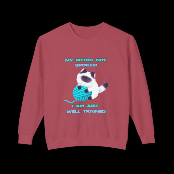 Adorable Kitty Sweatshirt with the fun quote 'My Kitty's Not Spoiled, I'm Just Well-Trained'. This sweatshirt gives off a cozy and cute vibe, perfect for cat lovers who want to show off their love for their feline friends. Ideal for casual wear or lounging at home, this sweatshirt is great for cat-themed holidays or everyday wear.
